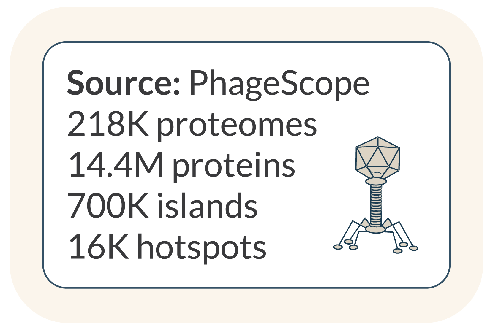 iLund4u includes two precomputed hotspot databases derived from phage and plasmid sequences. This online resource catalogues phage-associated hotspots and accessory protein families. It consists of 242.8K protein families encoded in 16K hotspots across 218K phage genomes, remaining after deduplication and filtering of the initial PhageScope dataset.